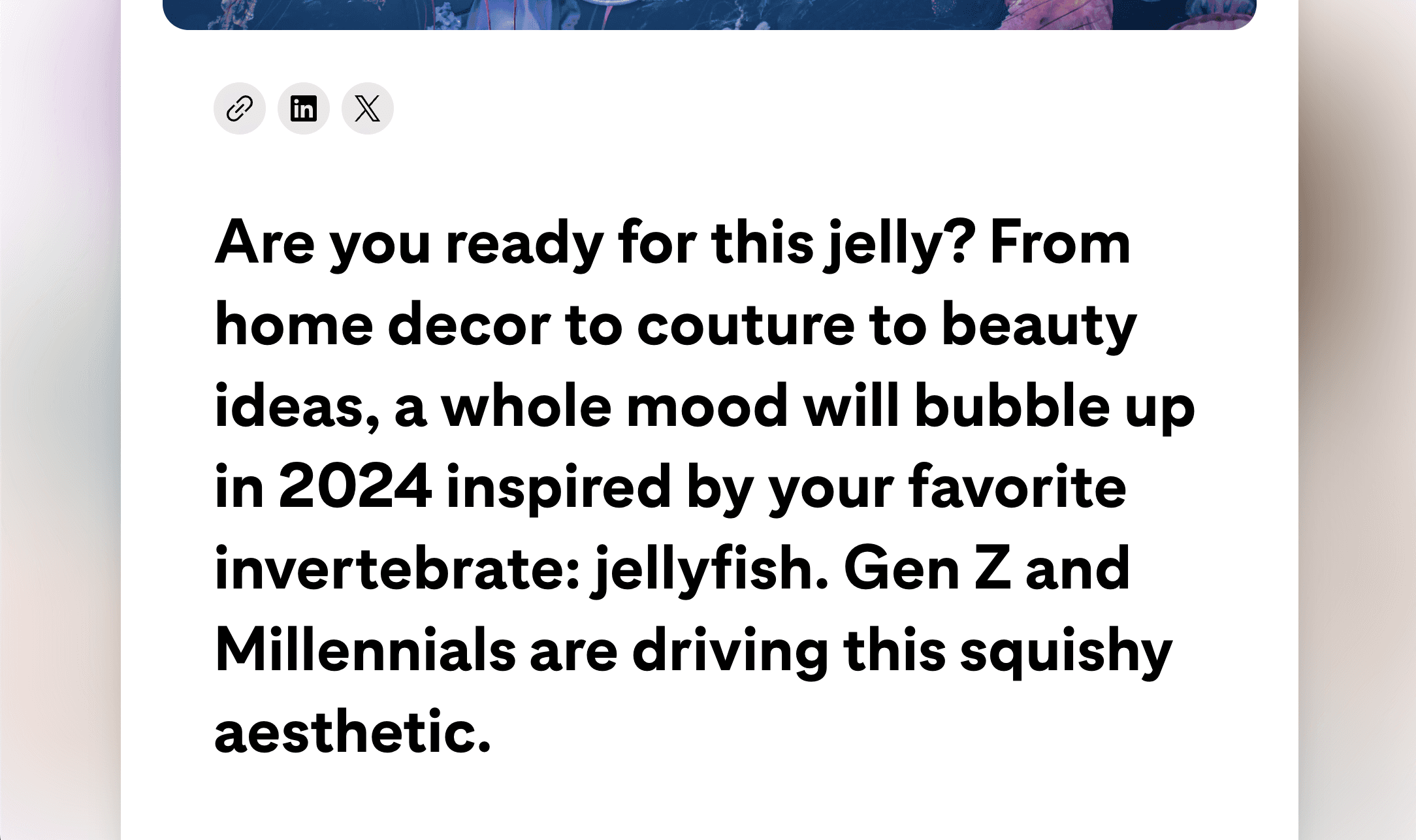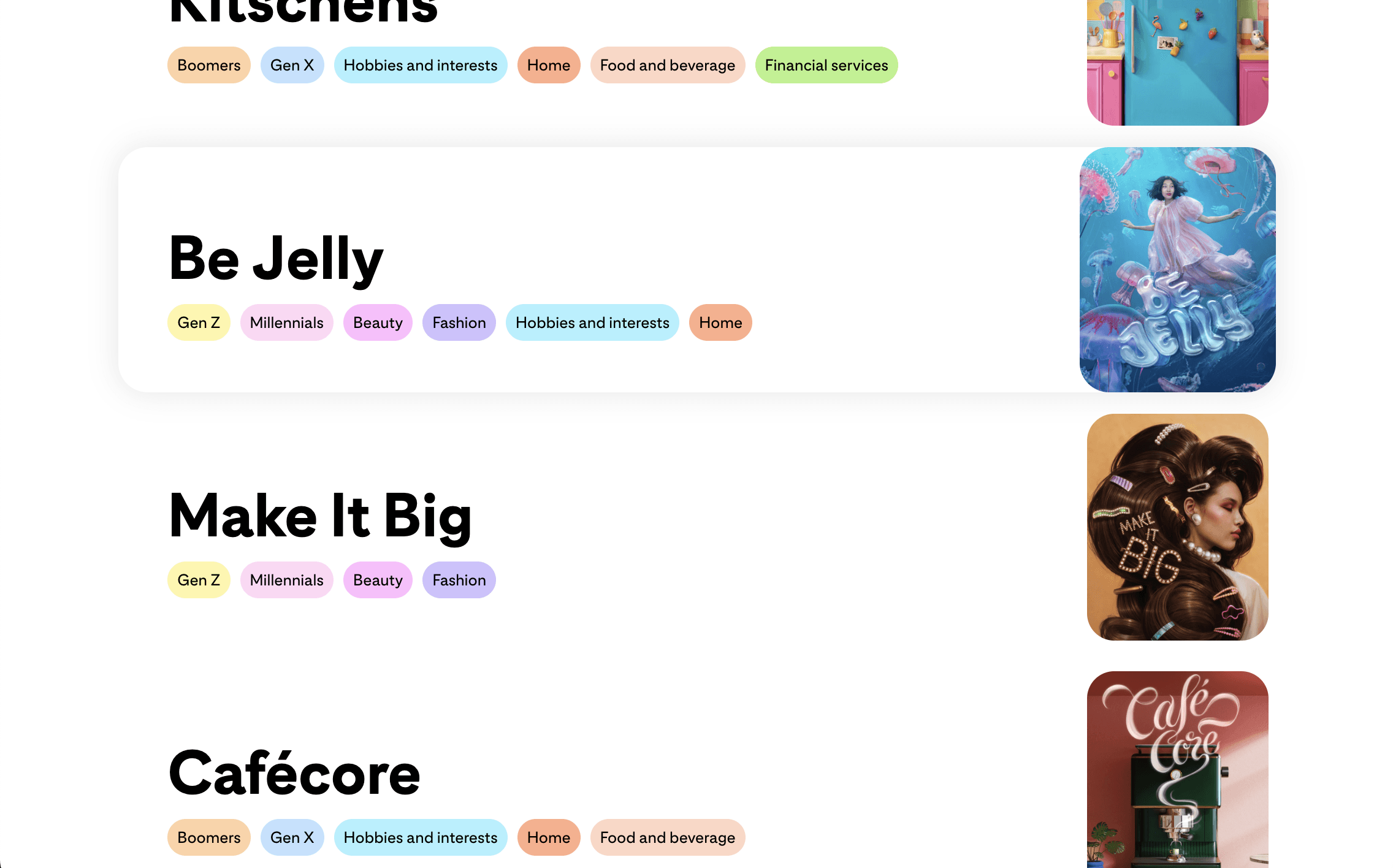 A core tenet of the design approach was to encourage exploration and the feeling that you are viewing all the content in a space, opposed to jumping from page to page. Once you select a trend, the modal with the key image slides up and blurs the background, leaving the feeling that you haven't left the grid. You can easily click off the modal or scroll off the bottom to exit the trend, or navigate to adjacent trend modals by using the paddle nav at the top.