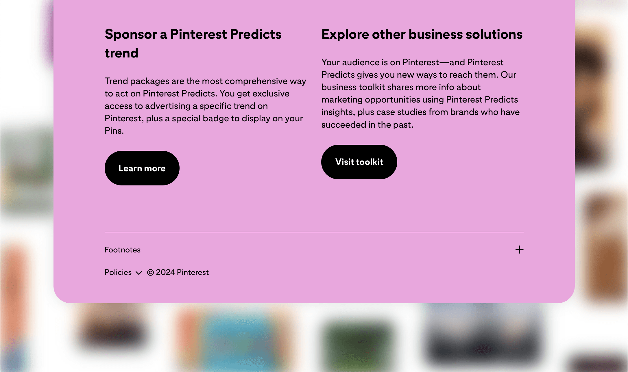 Pinterest Predicts is a not-yet-trending report that shares emerging trends for the coming year. It's your guide to what people will shop, try and buy next. I worked with the Pinterest business team to deliver a new way to explore the trends in a way that appeals to b2b and b2c alike.